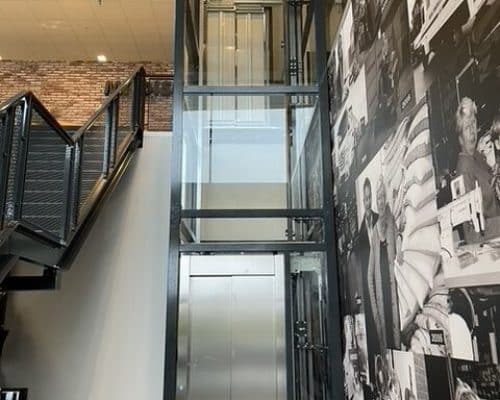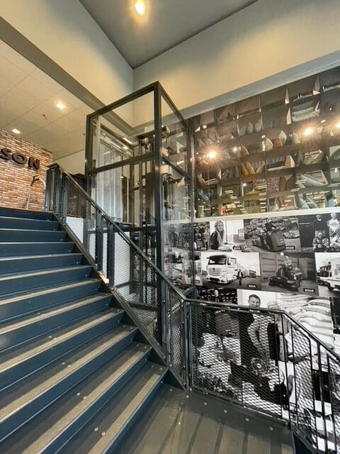 Voor de Firma Madison in Almelo hebben we in het bestaande pand een op maat gemaakte glazenliftschacht met bijbehorende lift. Het type lift is de HLB Plus met automatische schuifdeuren.